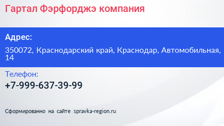 Гартал-Фэрфорджэ, компания по адресу 350072, Краснодарский край, Краснодар, Автомобильная, 14 в дальнейшем Организация, размещена в следующих категориях:
