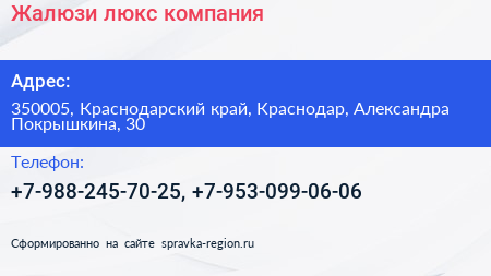 Жалюзи-люкс, компания по адресу 350005, Краснодарский край, Краснодар, Александра Покрышкина, 30 в дальнейшем Организация, размещена в следующих категориях: