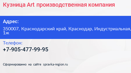 Кузница Art, производственная компания по адресу 350007, Краснодарский край, Краснодар, Индустриальная, 1ж в дальнейшем Организация, размещена в следующих категориях: