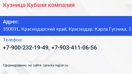 Кузница Кубани, компания по адресу 350031, Краснодарский край, Краснодар, Карла Гусника, 17 в дальнейшем Организация, размещена в следующих категориях: