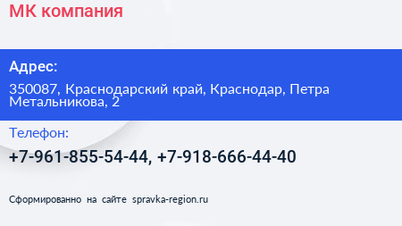 МК, компания по адресу 350087, Краснодарский край, Краснодар, Петра Метальникова, 2 в дальнейшем Организация, размещена в следующих категориях:
