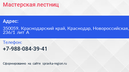 Мастерская лестниц по адресу 350059, Краснодарский край, Краснодар, Новороссийская, 236/1 лит А в дальнейшем Организация, размещена в следующих категориях: