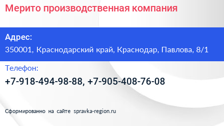 Мерито, производственная компания по адресу 350001, Краснодарский край, Краснодар, Павлова, 8/1 в дальнейшем Организация, размещена в следующих категориях: