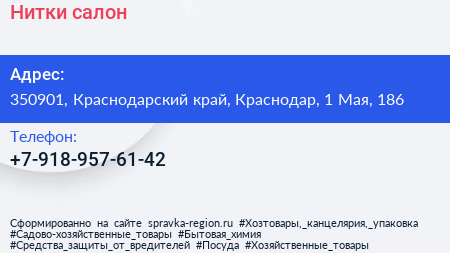 Нитки, салон по адресу 350901, Краснодарский край, Краснодар, 1 Мая, 186 в дальнейшем Организация, размещена в следующих категориях: