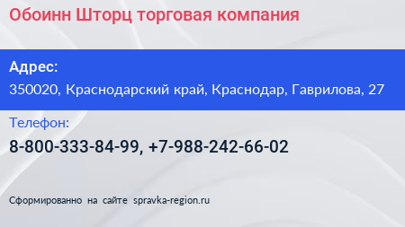 Обоинн & Шторц, торговая компания по адресу 350020, Краснодарский край, Краснодар, Гаврилова, 27 в дальнейшем Организация, размещена в следующих категориях: