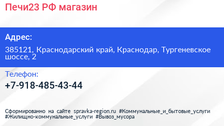 Печи23.РФ, магазин по адресу 385121, Краснодарский край, Краснодар, Тургеневское шоссе, 2 в дальнейшем Организация, размещена в следующих категориях: