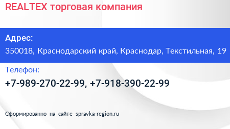 REALTEX, торговая компания по адресу 350018, Краснодарский край, Краснодар, Текстильная, 19 в дальнейшем Организация, размещена в следующих категориях: