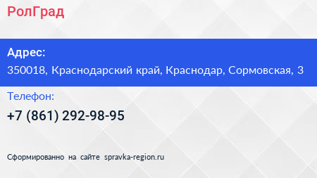 РолГрад по адресу 350018, Краснодарский край, Краснодар, Сормовская, 3 в дальнейшем Организация, размещена в следующих категориях: