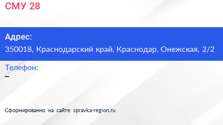 СМУ-28 по адресу 350018, Краснодарский край, Краснодар, Онежская, 2/2 в дальнейшем Организация, размещена в следующих категориях: