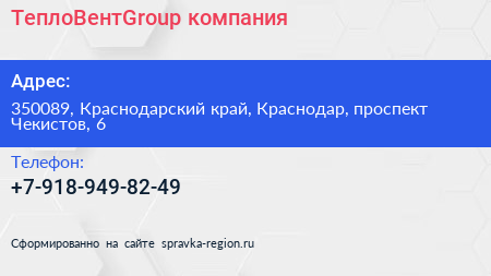 ТеплоВентGroup, компания по адресу 350089, Краснодарский край, Краснодар, проспект Чекистов, 6 в дальнейшем Организация, размещена в следующих категориях: