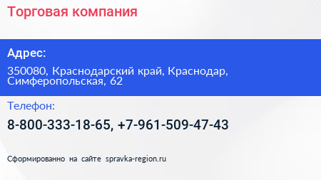 Торговая компания по адресу 350080, Краснодарский край, Краснодар, Симферопольская, 62 в дальнейшем Организация, размещена в следующих категориях: