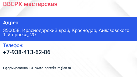 ВВЕРХ, мастерская по адресу 350058, Краснодарский край, Краснодар, Айвазовского 1-й проезд, 20 в дальнейшем Организация, размещена в следующих категориях: