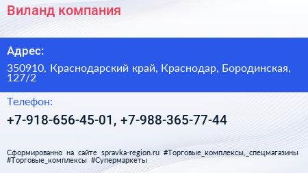 Для связи с организацией воспользуйтесь номером телефона: +7-918-656-45-01, +7-988-365-77-44. Пн: c 09:00-17:00, Вт: c 09:00-17:00, Ср: c 09:00-17:00, Чт: c 09:00-17:00, Пт: c 09:00-17:00, Сб: c 09:00-15:00, Вс: выходной, вы можете обратиться в эту организацию.