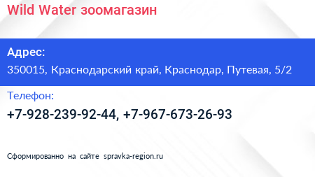 Wild-Water, зоомагазин по адресу 350015, Краснодарский край, Краснодар, Путевая, 5/2 в дальнейшем Организация, размещена в следующих категориях: