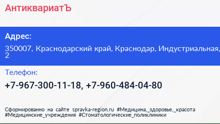 АнтиквариатЪ по адресу 350007, Краснодарский край, Краснодар, Индустриальная, 2 в дальнейшем Организация, размещена в следующих категориях: