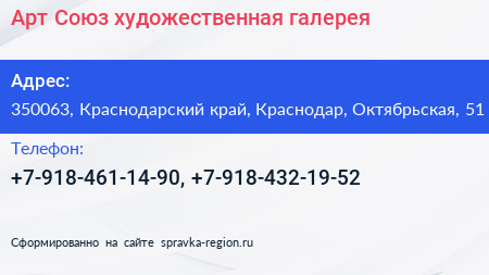 Арт-Союз, художественная галерея по адресу 350063, Краснодарский край, Краснодар, Октябрьская, 51 в дальнейшем Организация, размещена в следующих категориях: