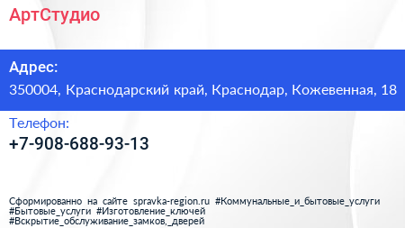 АртСтудио по адресу 350004, Краснодарский край, Краснодар, Кожевенная, 18 в дальнейшем Организация, размещена в следующих категориях: