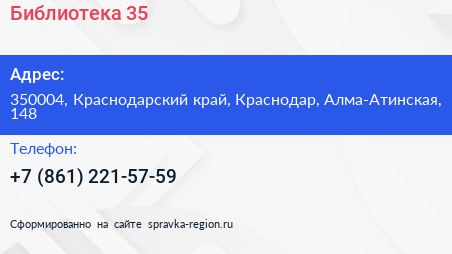 Библиотека №35 по адресу 350004, Краснодарский край, Краснодар, Алма-Атинская, 148 в дальнейшем Организация, размещена в следующих категориях: