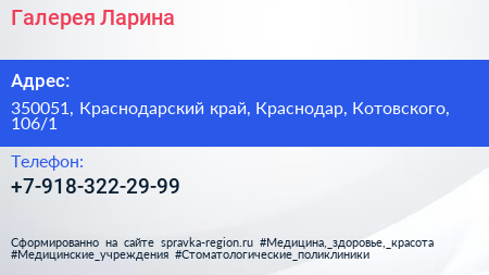Галерея Ларина по адресу 350051, Краснодарский край, Краснодар, Котовского, 106/1 в дальнейшем Организация, размещена в следующих категориях: