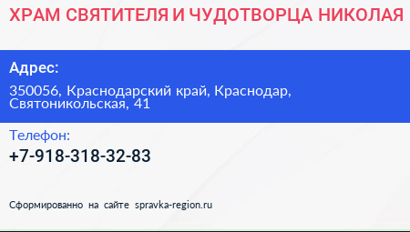 ХРАМ СВЯТИТЕЛЯ И ЧУДОТВОРЦА НИКОЛАЯ по адресу 350056, Краснодарский край, Краснодар, Святоникольская, 41 в дальнейшем Организация, размещена в следующих категориях: