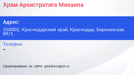 Храм Архистратига Михаила по адресу 350002, Краснодарский край, Краснодар, Березанская, 89/1 в дальнейшем Организация, размещена в следующих категориях: