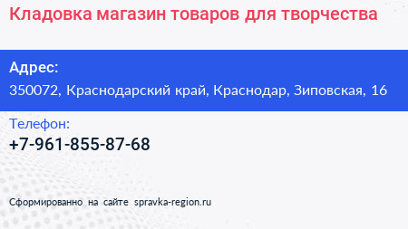 Кладовка, магазин товаров для творчества по адресу 350072, Краснодарский край, Краснодар, Зиповская, 16 в дальнейшем Организация, размещена в следующих категориях: