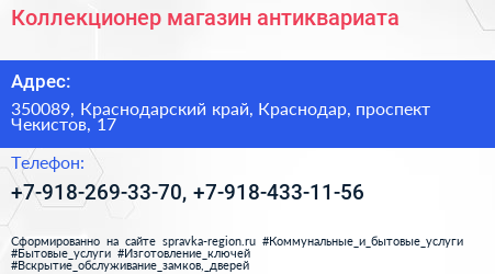 Коллекционер, магазин антиквариата по адресу 350089, Краснодарский край, Краснодар, проспект Чекистов, 17 в дальнейшем Организация, размещена в следующих категориях: