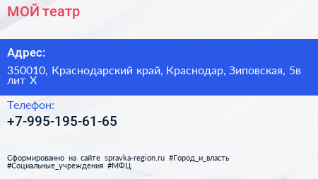 МОЙ, театр по адресу 350010, Краснодарский край, Краснодар, Зиповская, 5в лит Х в дальнейшем Организация, размещена в следующих категориях: