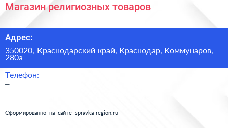 Магазин религиозных товаров по адресу 350020, Краснодарский край, Краснодар, Коммунаров, 280а в дальнейшем Организация, размещена в следующих категориях: