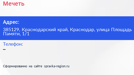 Мечеть по адресу 385129, Краснодарский край, Краснодар, улица Площадь Памяти, 1/1 в дальнейшем Организация, размещена в следующих категориях: