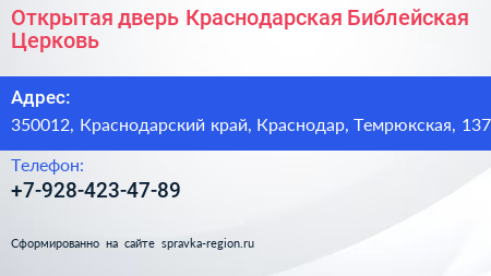 Открытая дверь, Краснодарская Библейская Церковь по адресу 350012, Краснодарский край, Краснодар, Темрюкская, 137 в дальнейшем Организация, размещена в следующих категориях: