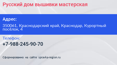 Русский дом вышивки, мастерская по адресу 350061, Краснодарский край, Краснодар, Курортный посёлок, 4 в дальнейшем Организация, размещена в следующих категориях: