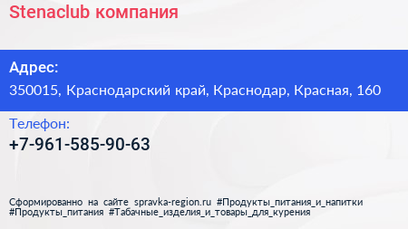 Stenaclub, компания по адресу 350015, Краснодарский край, Краснодар, Красная, 160 в дальнейшем Организация, размещена в следующих категориях:
