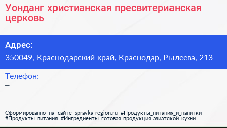 Уонданг, христианская пресвитерианская церковь по адресу 350049, Краснодарский край, Краснодар, Рылеева, 213 в дальнейшем Организация, размещена в следующих категориях: