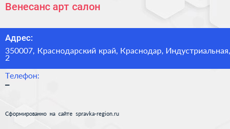 Венесанс, арт-салон по адресу 350007, Краснодарский край, Краснодар, Индустриальная, 2 в дальнейшем Организация, размещена в следующих категориях: