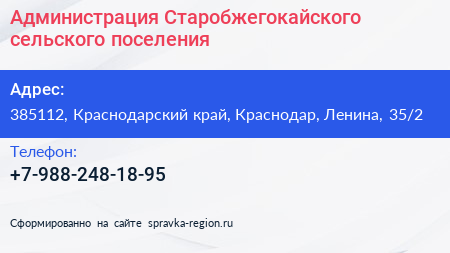 Администрация Старобжегокайского сельского поселения по адресу 385112, Краснодарский край, Краснодар, Ленина, 35/2 в дальнейшем Организация, размещена в следующих категориях: