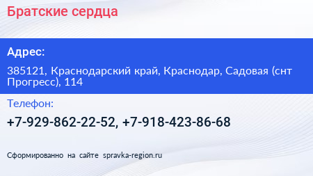Братские сердца по адресу 385121, Краснодарский край, Краснодар, Садовая (снт Прогресс), 114 в дальнейшем Организация, размещена в следующих категориях: