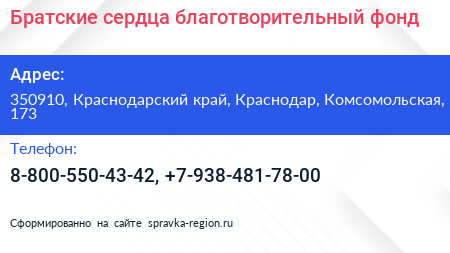 Братские сердца, благотворительный фонд по адресу 350910, Краснодарский край, Краснодар, Комсомольская, 173 в дальнейшем Организация, размещена в следующих категориях: