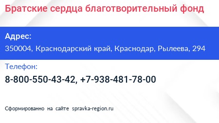 Братские сердца, благотворительный фонд по адресу 350004, Краснодарский край, Краснодар, Рылеева, 294 в дальнейшем Организация, размещена в следующих категориях: