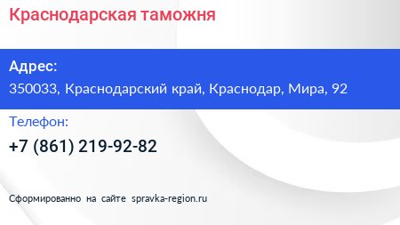 Краснодарская таможня по адресу 350033, Краснодарский край, Краснодар, Мира, 92 в дальнейшем Организация, размещена в следующих категориях:
