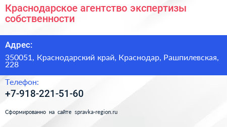 Краснодарское агентство экспертизы собственности по адресу 350051, Краснодарский край, Краснодар, Рашпилевская, 228 в дальнейшем Организация, размещена в следующих категориях: