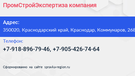 ПромСтройЭкспертиза, компания по адресу 350020, Краснодарский край, Краснодар, Коммунаров, 268 в дальнейшем Организация, размещена в следующих категориях: