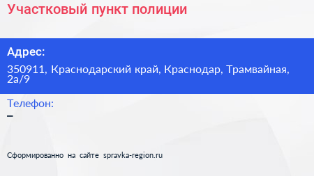 Участковый пункт полиции по адресу 350911, Краснодарский край, Краснодар, Трамвайная, 2а/9 в дальнейшем Организация, размещена в следующих категориях: