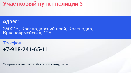 Участковый пункт полиции №3 по адресу 350015, Краснодарский край, Краснодар, Красноармейская, 126 в дальнейшем Организация, размещена в следующих категориях: