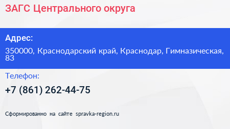 ЗАГС Центрального округа по адресу 350000, Краснодарский край, Краснодар, Гимназическая, 83 в дальнейшем Организация, размещена в следующих категориях: