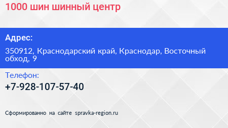 1000 шин, шинный центр по адресу 350912, Краснодарский край, Краснодар, Восточный обход, 9 в дальнейшем Организация, размещена в следующих категориях: