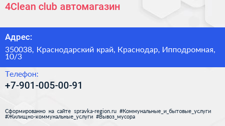 4Clean.club, автомагазин по адресу 350038, Краснодарский край, Краснодар, Ипподромная, 10/3 в дальнейшем Организация, размещена в следующих категориях: