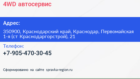 4WD, автосервис по адресу 350900, Краснодарский край, Краснодар, Первомайская 1-я (ст Краснодаргорстрой), 21 в дальнейшем Организация, размещена в следующих категориях: