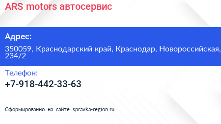 ARS-motors, автосервис по адресу 350059, Краснодарский край, Краснодар, Новороссийская, 234/2 в дальнейшем Организация, размещена в следующих категориях:
