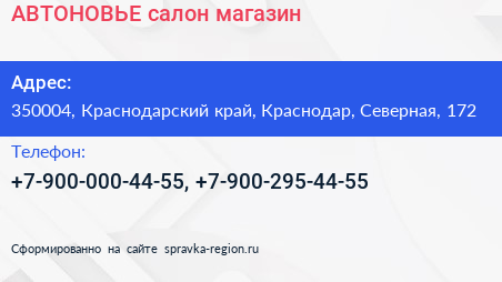 АВТОНОВЬЕ, салон-магазин по адресу 350004, Краснодарский край, Краснодар, Северная, 172 в дальнейшем Организация, размещена в следующих категориях: